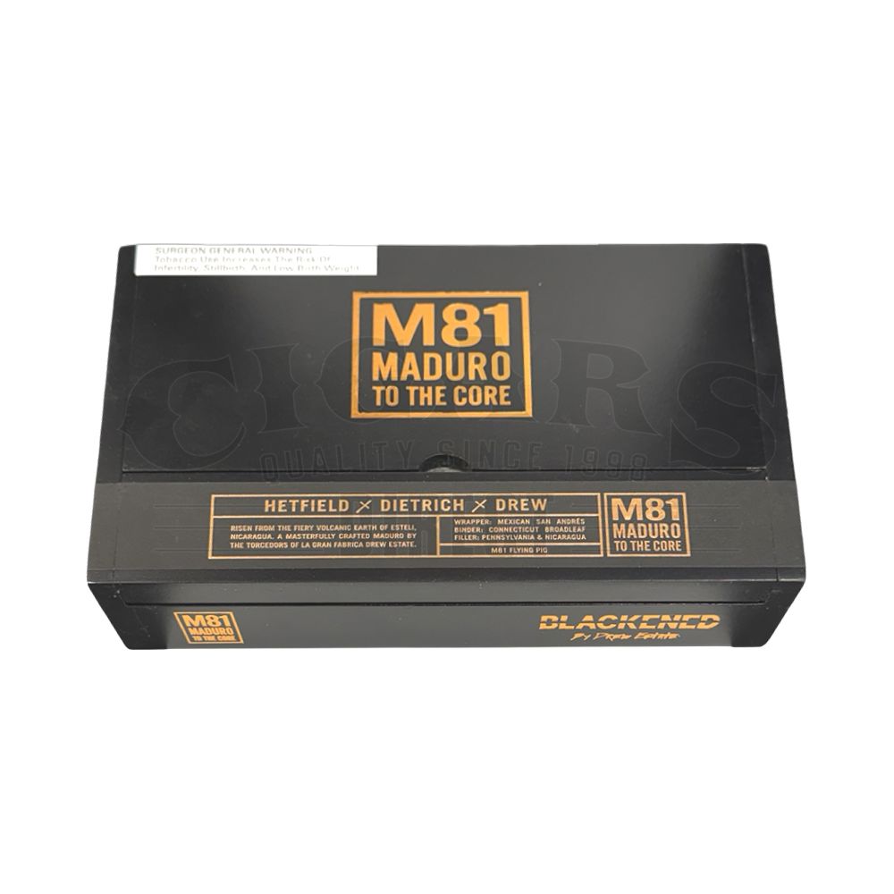 This Drew Estate Blackened M81 Flying Pig cigar is made in Nicaragua. Outside, you'll find a Mexican San Andres wrapper. Inside, the binder is a USA Connecticut Broadleaf and the filler is Nicaraguan & USA Pennsylvania. This is a Perfecto cigar with a length of 4.00 and a ring gauge of 60.